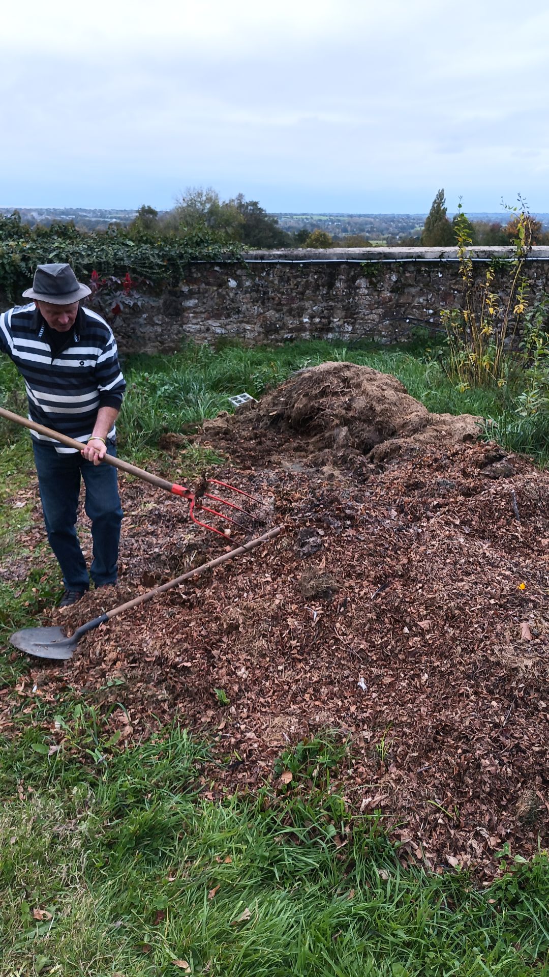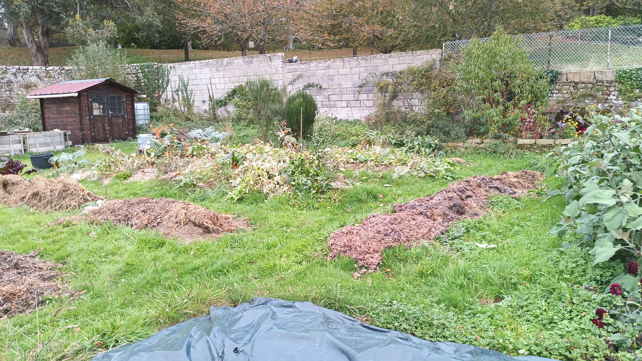 Entre deux averses et un coup de vent, nous avons couvert les parcelles vides d'un mélange de feuilles mortes et de tonte d'herbe.