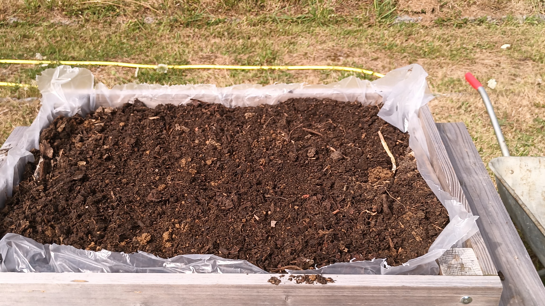 Commencez par installer un film plastique qui protègera le bois. Vous pouvez percer ce film à quelques endroits sur les bords, à environ 2 centimètres du fond afin de faire une réserve d'eau naturelle.