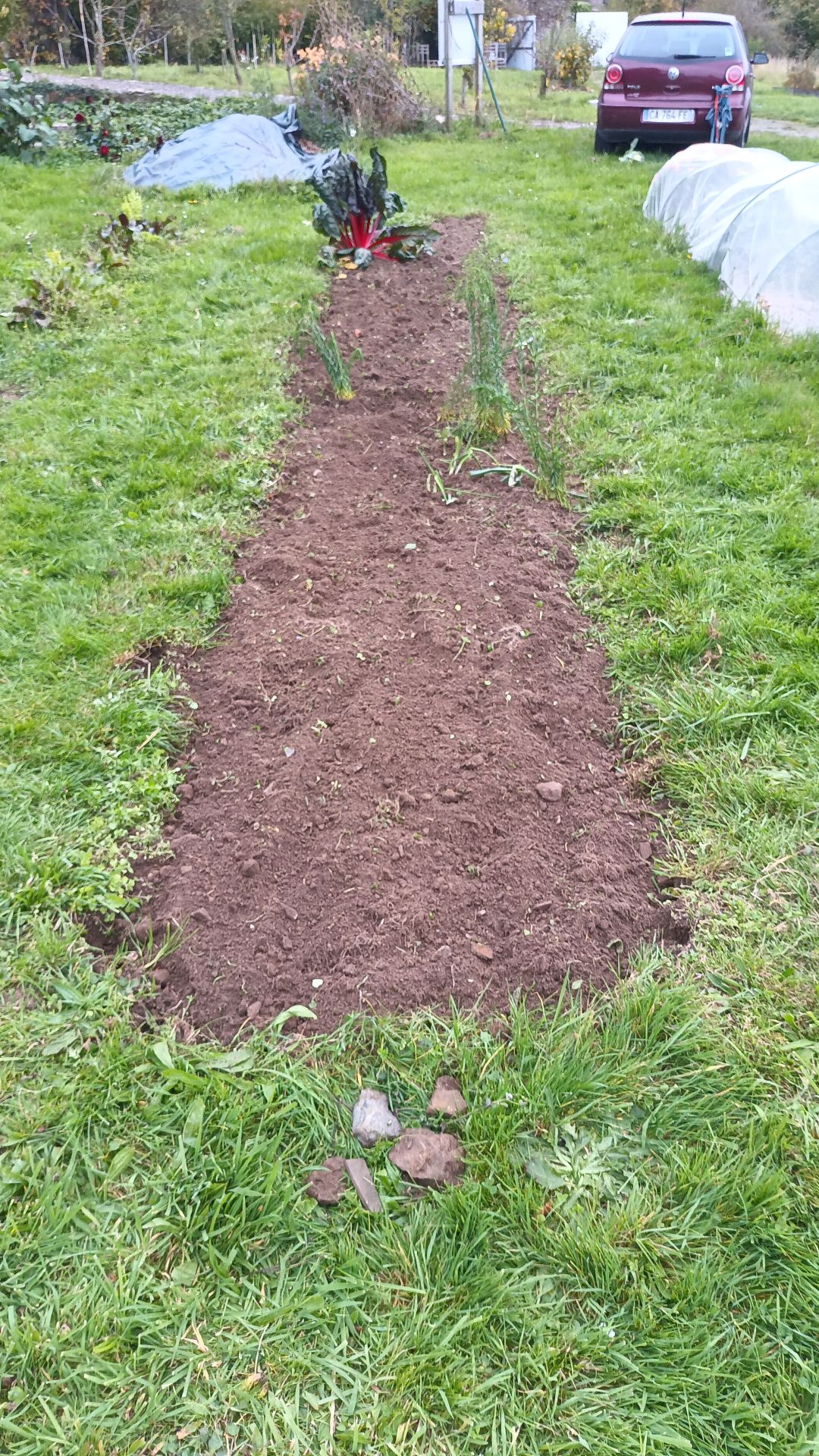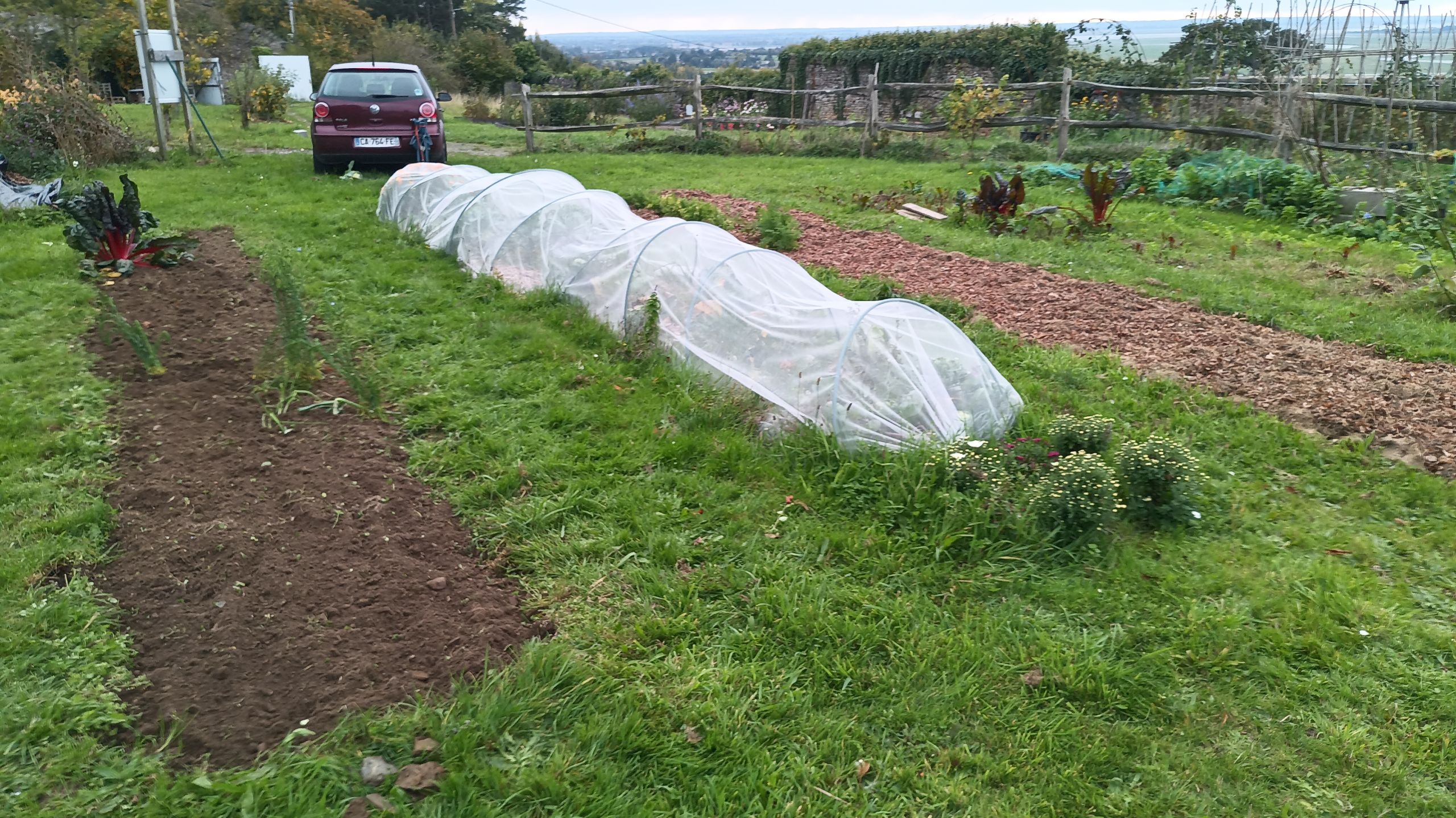 Entre deux averses et un coup de vent, nous avons couvert les parcelles vides d'un mélange de feuilles mortes et de tonte d'herbe.