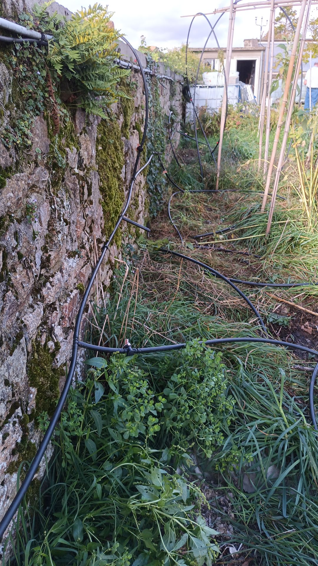 Les tubes d'arrosage qui trainaient dans les herbes hautes on été fixé le long du mur en hauteur.