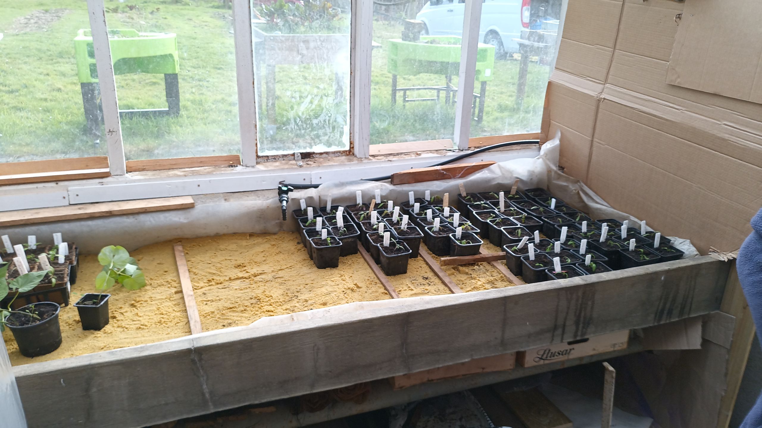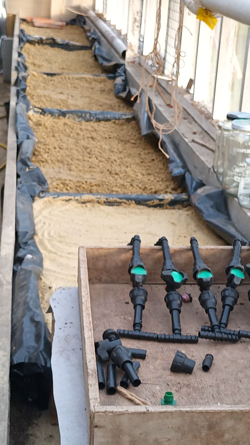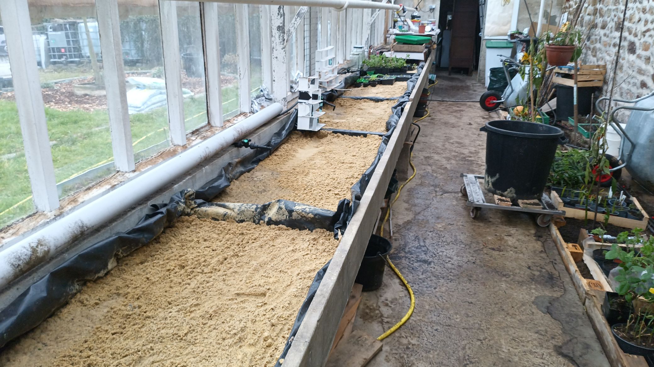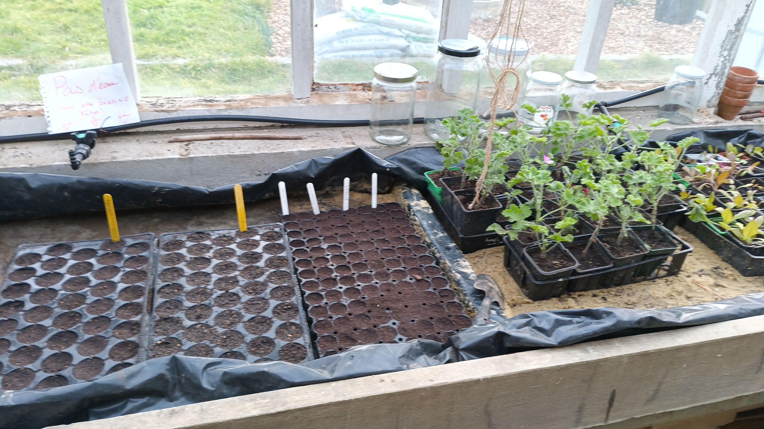Et à l'intérieur semis et repiquages étaient à l'ordre du jour, un bon travail de semis : Betteraves, persil coriandre oeillets d'inde oranges, et le repiquage des laitues batavia. A cette occasion, nous avons testé le remplissage des abcs de sable avec l'eau des cuves et malheureusement il va falloir reprendre le travail, la bâche a des fuites et on a inondé toute la serre.