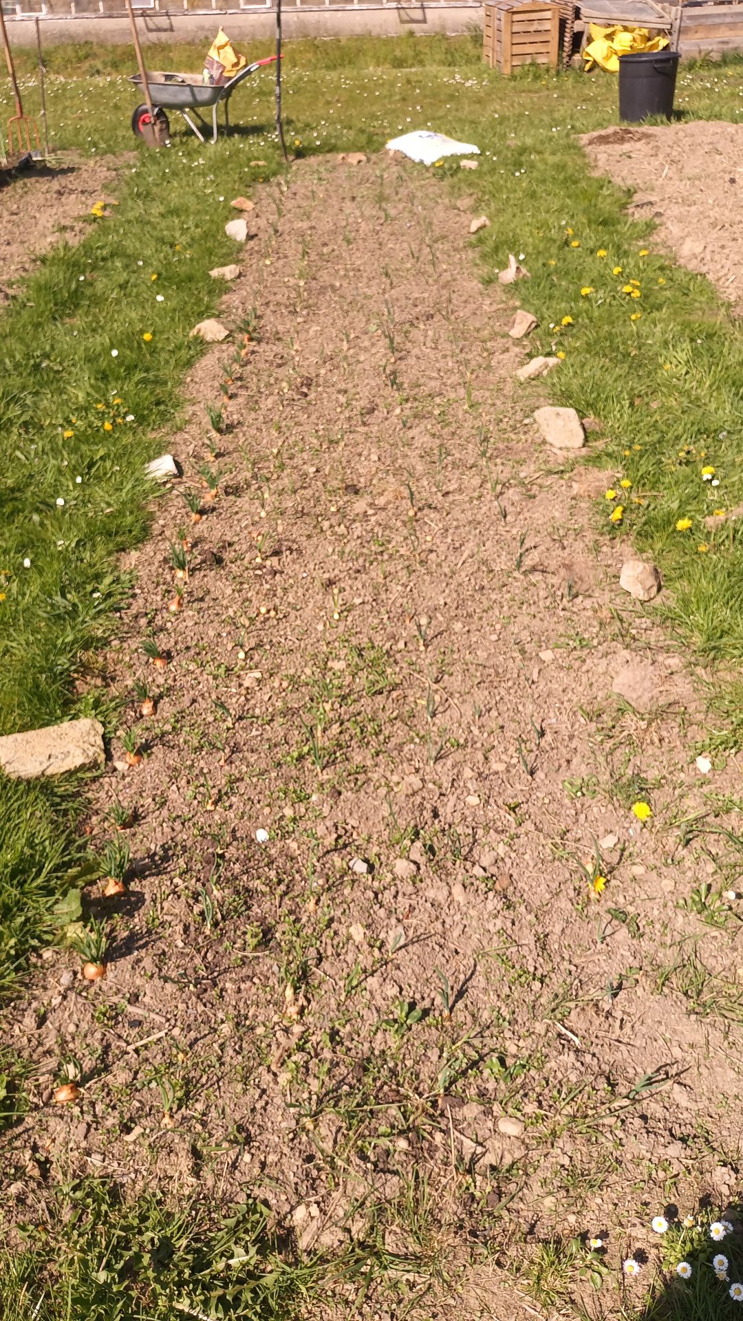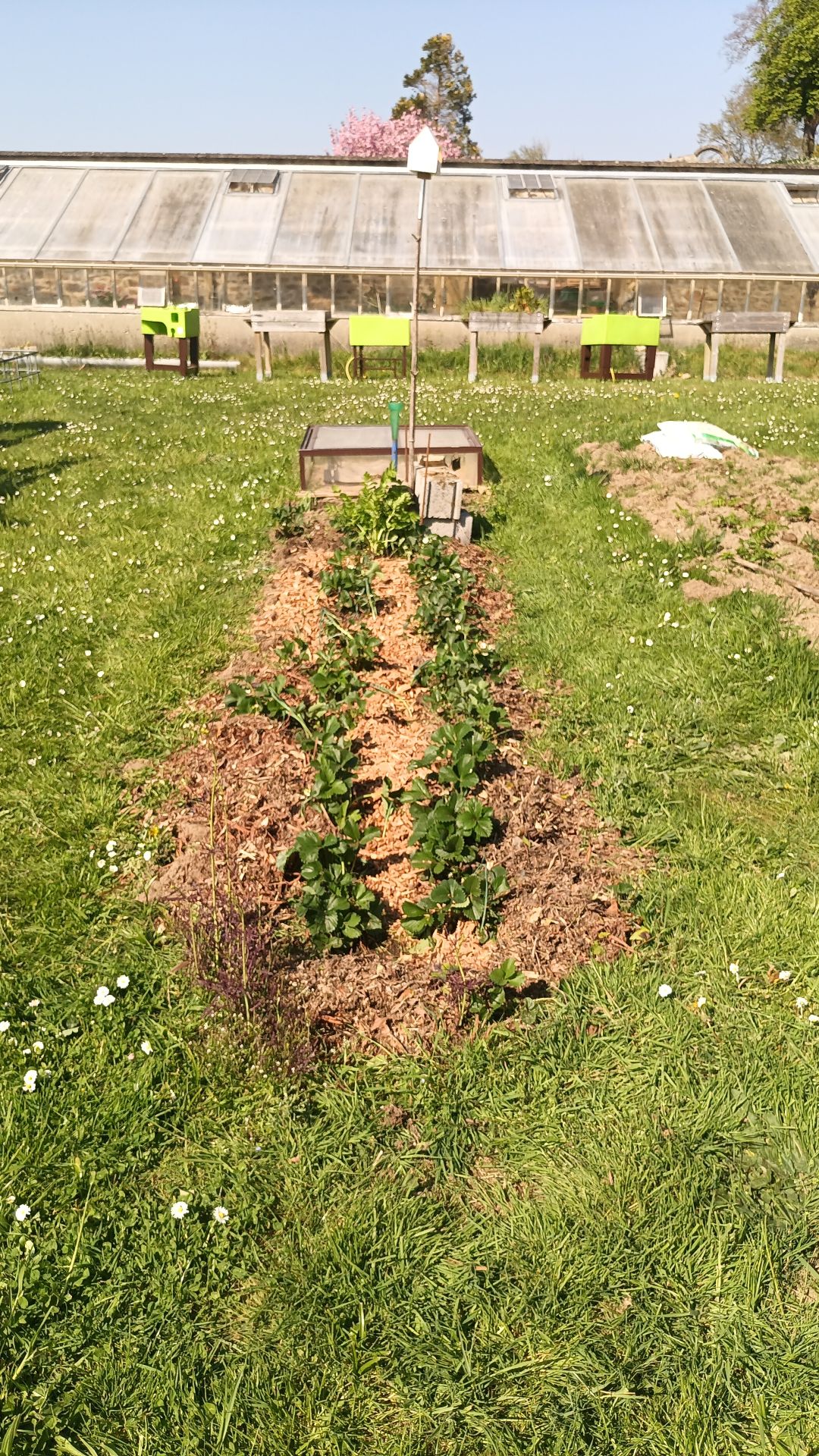 Fraisiers nettoyés et paillé Les petits pois sont bien partis tout comme les oignons