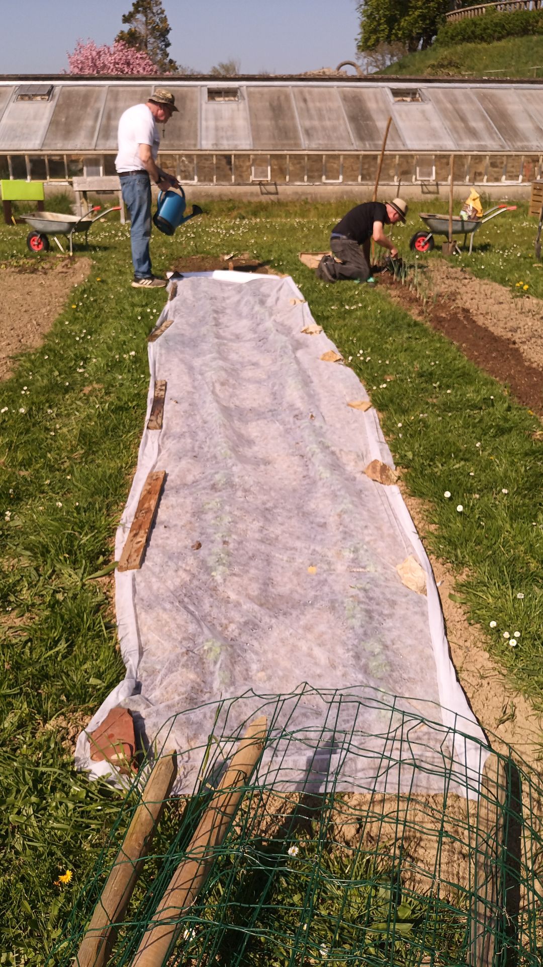 Aujourd'hui nous avons fait du desherbage (parcelles des oignons et des fraisiers), du nettoyage (débroussaillage de la zone de conservation pour pouvoir passer la tondeuse la semaine prochaine) et bien entendu toujours du repiquage pour les plants (betterave jaune, maïs jaune, rouge ou noir...) que nous pourrons vendre aux adhérents le premier mai lors de l'après-midi portes ouvertes. et pour finri encore quelques semis de courgettes concombres potimarron butternuts...