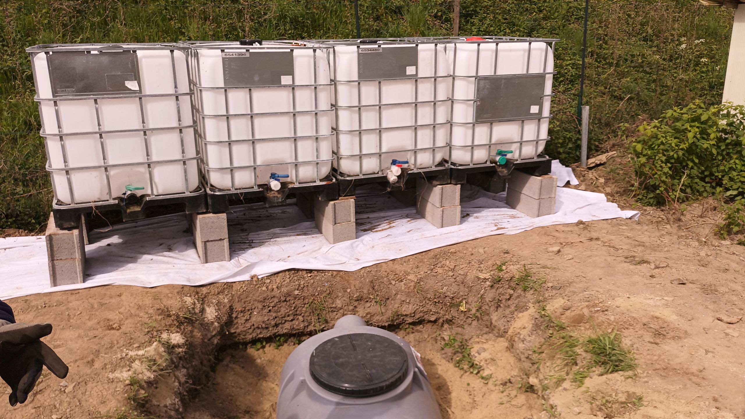 Voilà c'est fait après deux bonnes heures, pour descendre les parpaings, le sable, raccorder la cuve grise et positionner les cuves sur les parpaings. Il reste maintenant à raccorder les cuves ensemble, ajouter une pompe avec son alimentation solaire pour remonter l'eau.