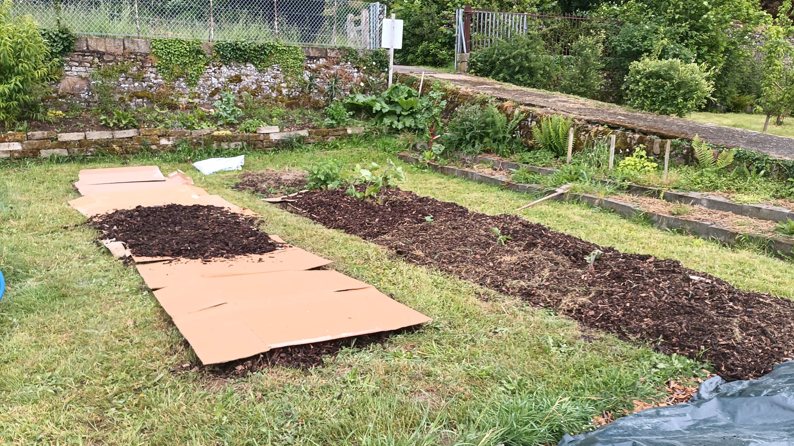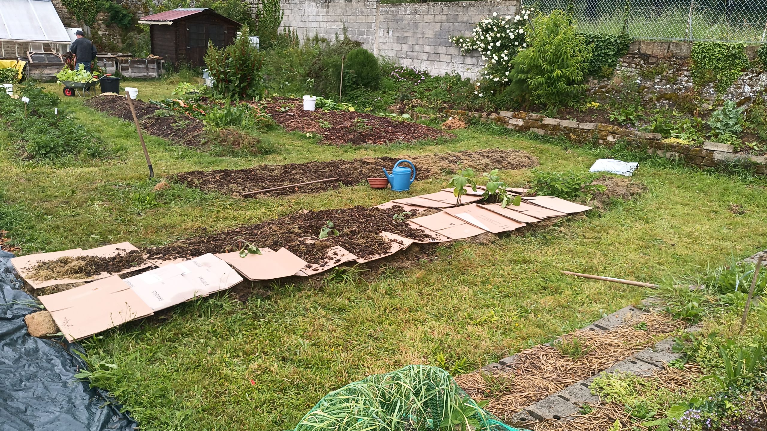 Du carton pour éviter la repousse des adventices, et du compost pré-maturé pour amender la terre gentillement.