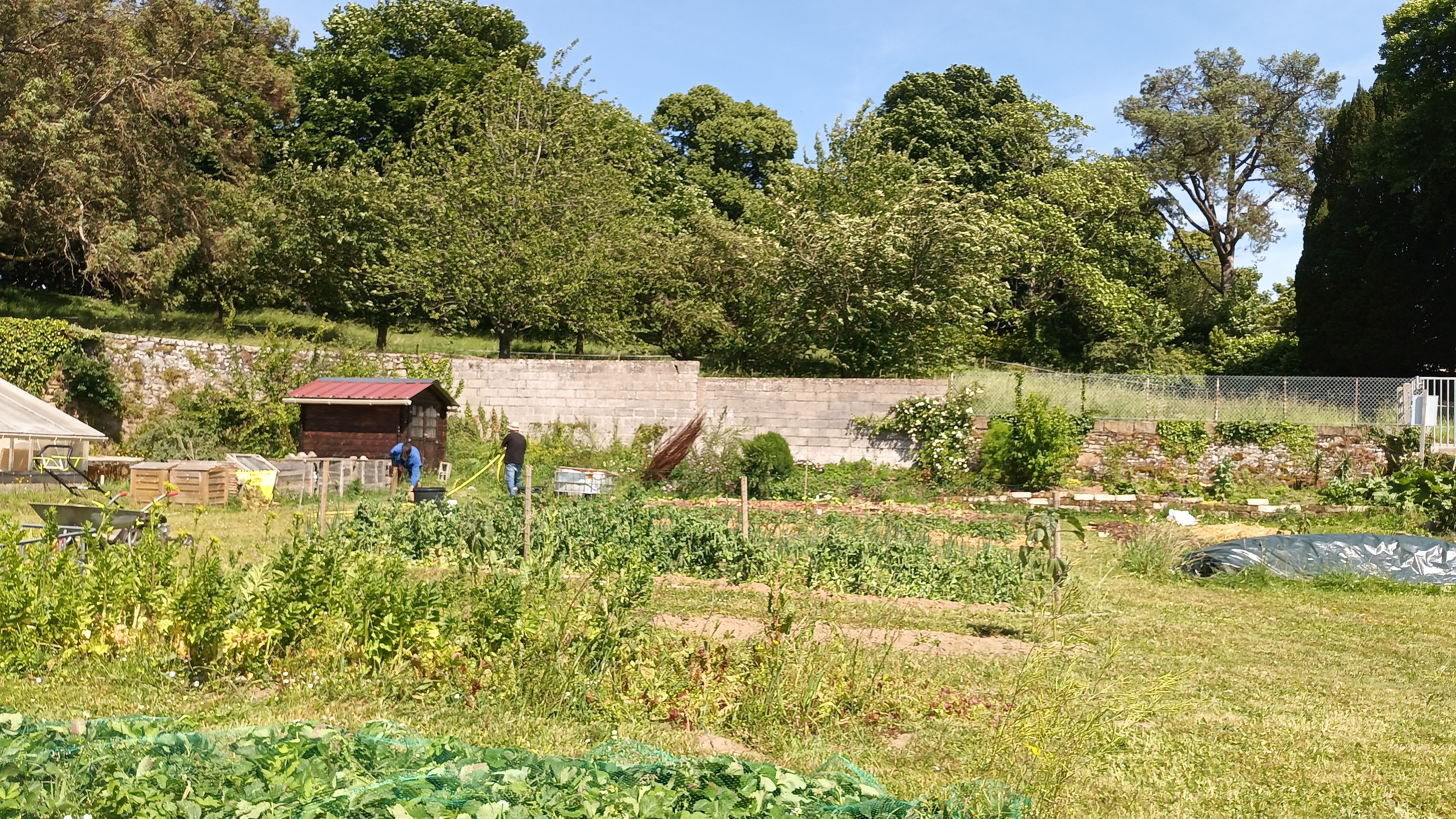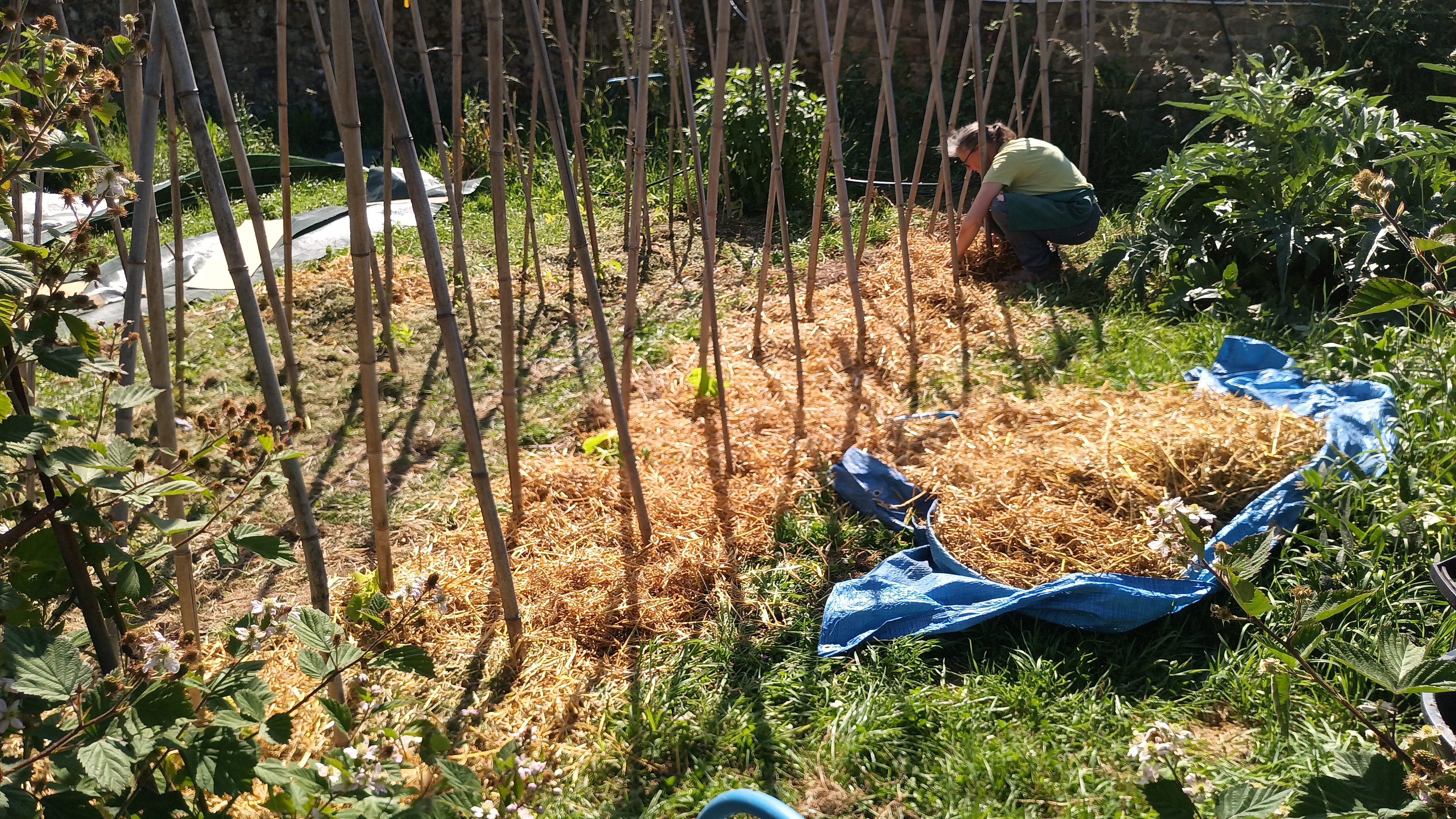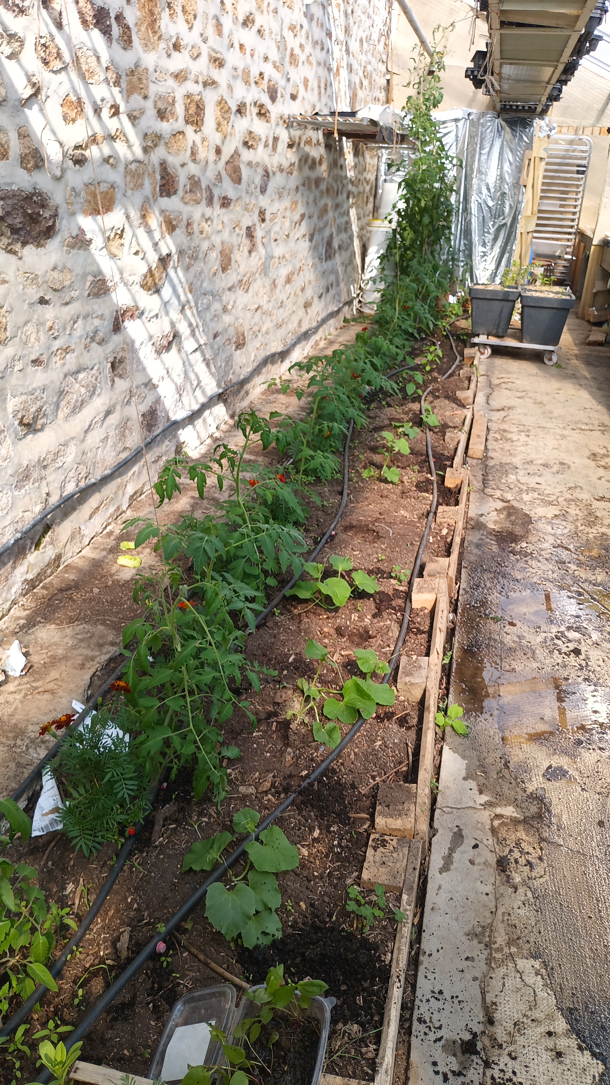 Nous avons eu du repiquage massif de tomates sur les parcelles extérieures, installation d'un treillage pour les concombres, mise en place d'un systeme d'arrosage automatisé pour les tomates à 'lintérieur de la serre, une couverture avec de la tonte et du broyage de paille.