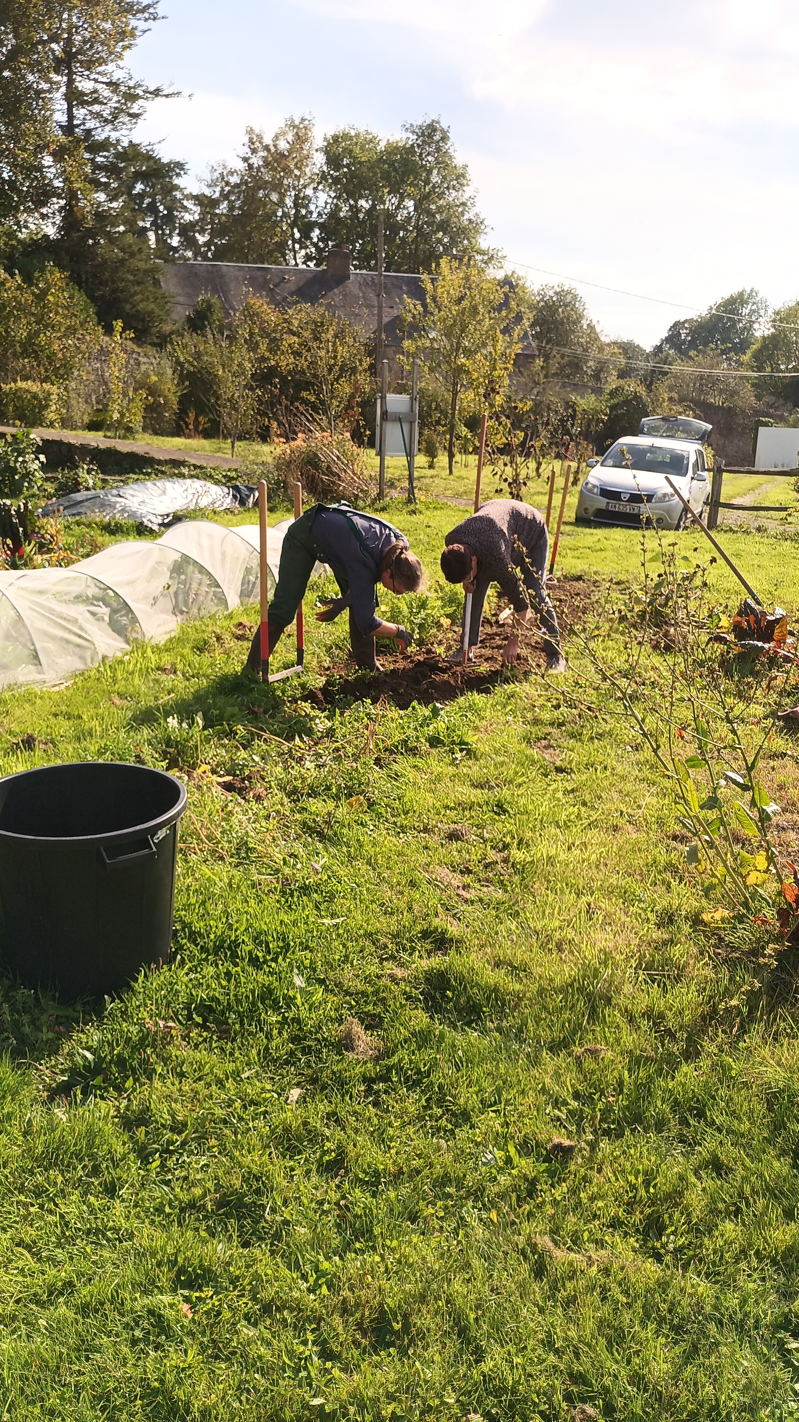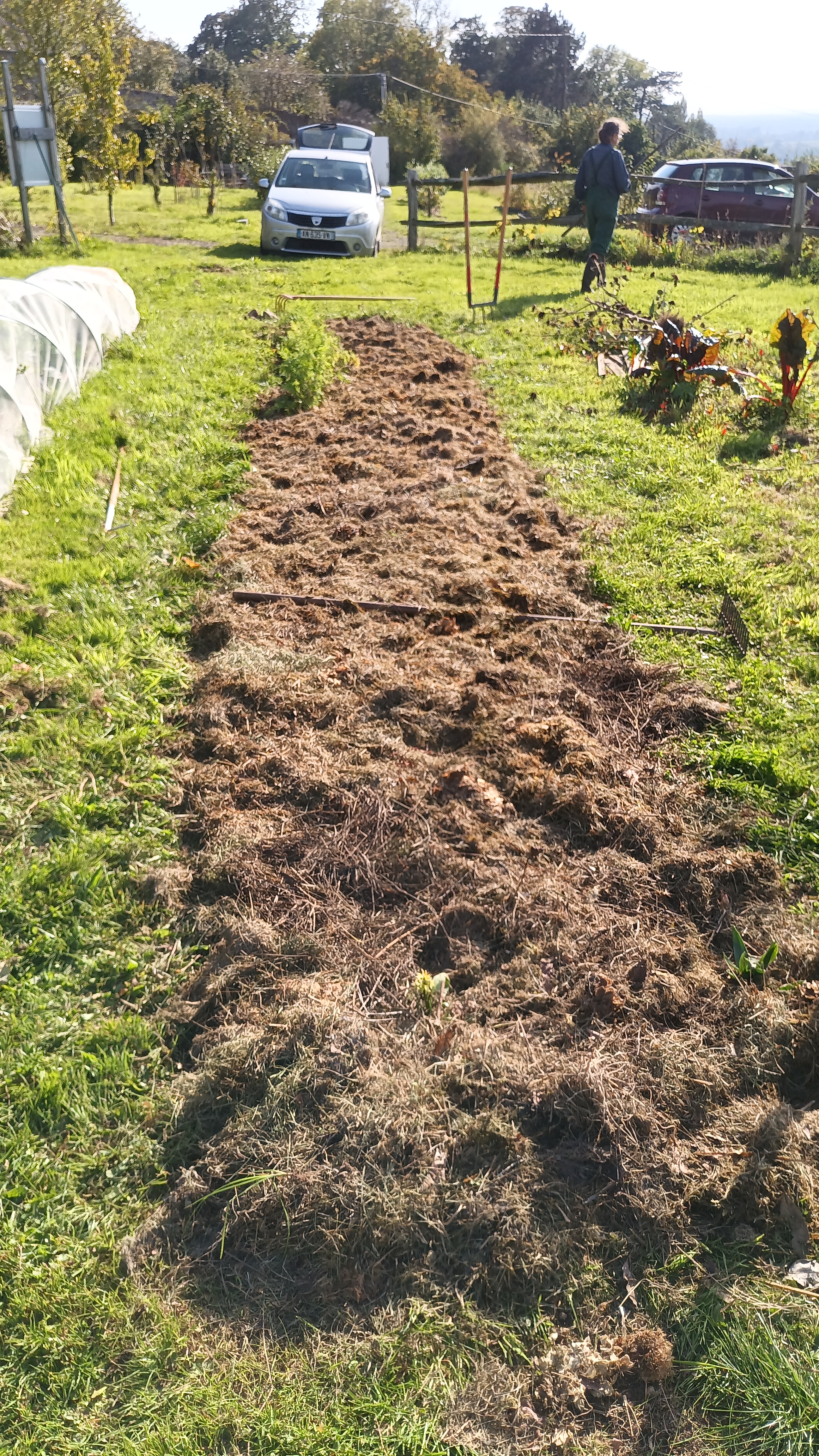 Entre deux averses et un coup de vent, nous avons couvert les parcelles vides d'un mélange de feuilles mortes et de tonte d'herbe.